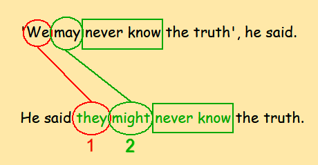 Remember to check the context for information about who and what pronouns and possessives refer to: 'I will soon give you your money back', he said. He told me he would soon give me my money back. He told us he would soon give us our money back. |