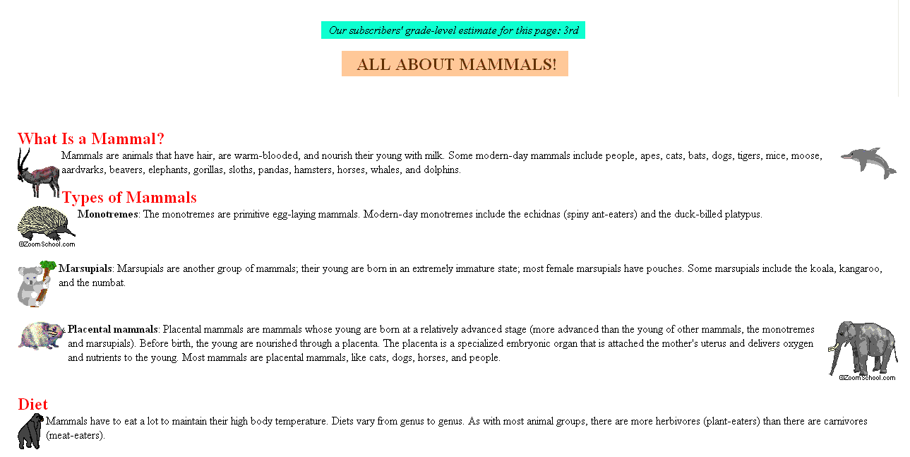 Download the image on the right (mammals.gif) to your computer (right-click on it and select "save image"). Your task is to write a webpage as similar as possible to this screenshot.JJCC