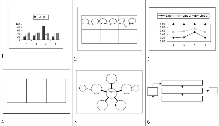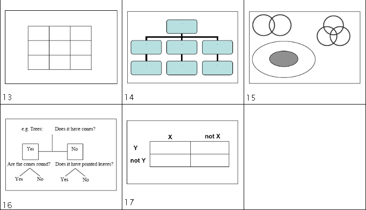Bar chart, Carroll diagram, Cycle, Flow diagram (or flow chart), Grid, Key: binary, Line graph, Mind map (descriptive), Pie chart, Process diagram or cause/ effect diagram, Quadrants, Storyboard, T-chart, Table, Time line, Tree diagram, Venn diagrams.