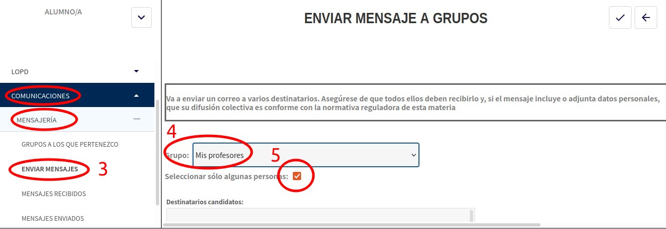 - Marca la casilla "Seleccionar sólo algunas personas" (si no lo haces, enviarás tu mensaje a TODOS tus profesores/as).
