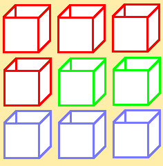 Some boxes are red, other boxes are green, the other boxes are blue. |
