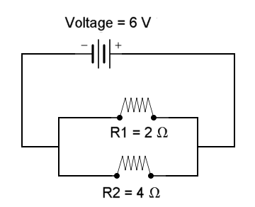 Problem: The voltage is 6 volts. The first resistance is 4 ohms. The second resistance is 2 ohms. What is the current flowing through the circuit? How much electricity will this circuit use up? This is a parallel circuit, so the current is different for each part of the circuit: