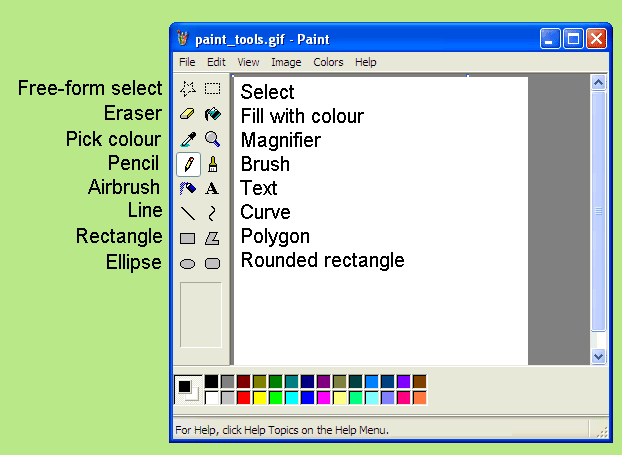 - Select a colour you like with the left button of the mouse from the colour palette at the bottom. If you don't like any of the colours in the palette,