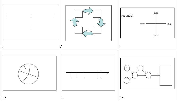 Bar chart, Carroll diagram, Cycle, Flow diagram (or flow chart), Grid, Key: binary, Line graph, Mind map (descriptive), Pie chart, Process diagram or cause/ effect diagram, Quadrants, Storyboard, T-chart, Table, Time line, Tree diagram, Venn diagrams.
